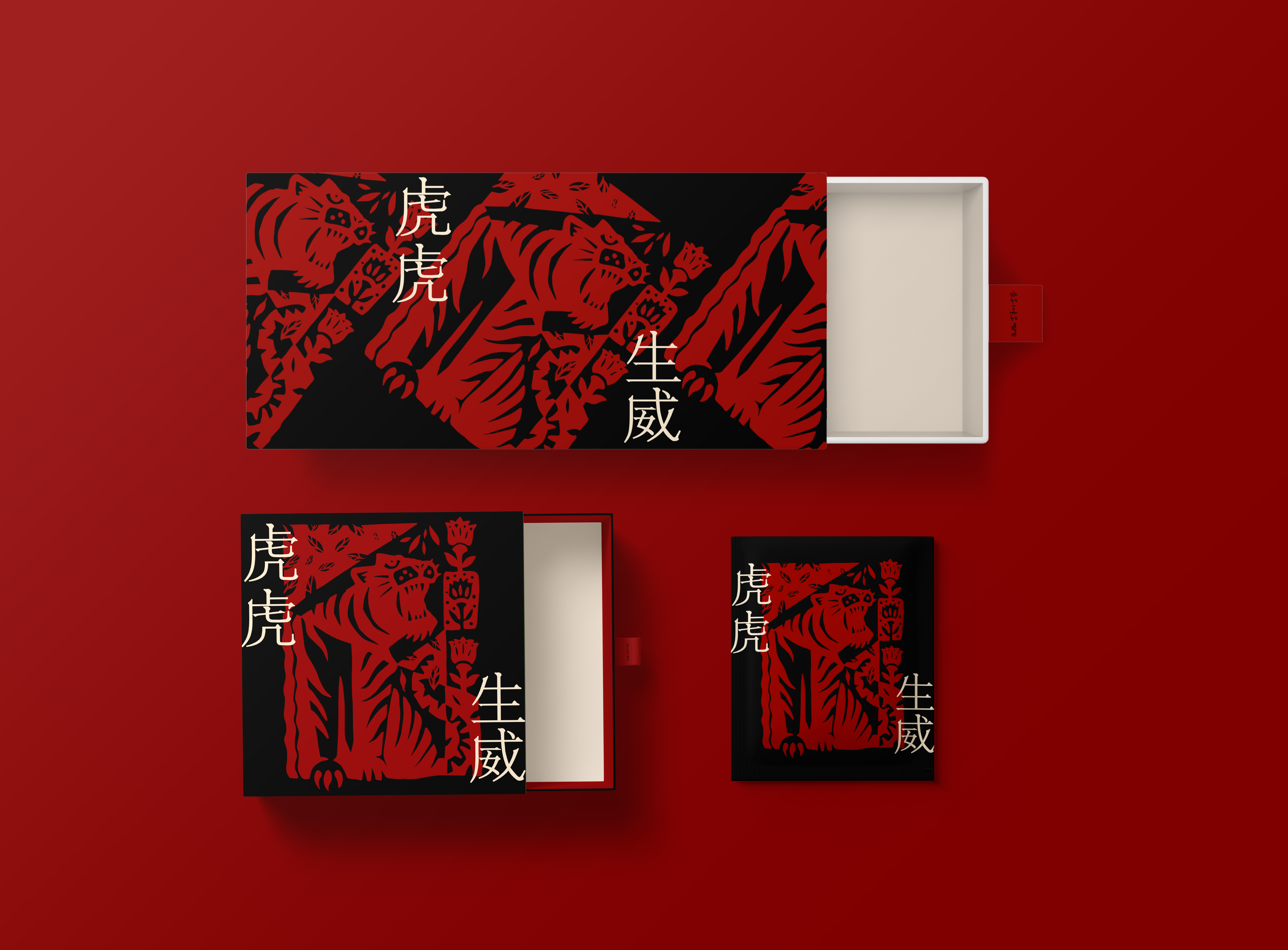 包装以剪纸的形式提取虎的元素,表达虎虎生威,生肖纪念饼作为中国传统春节习俗走亲访友的伴手佳礼物,选用传统的中国红,喜气洋洋,虎年送虎礼,福气满满。